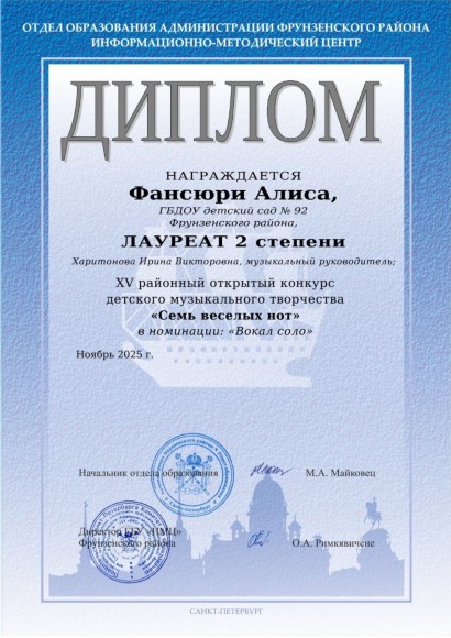 Диплом за участие в районном фестивале «Купчинские первоцветы».Музыкальный руководитель Харитонова И.В. |