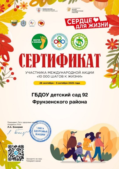 Сертификат участника всероссийской акции "!0000 шагов к жизни" |