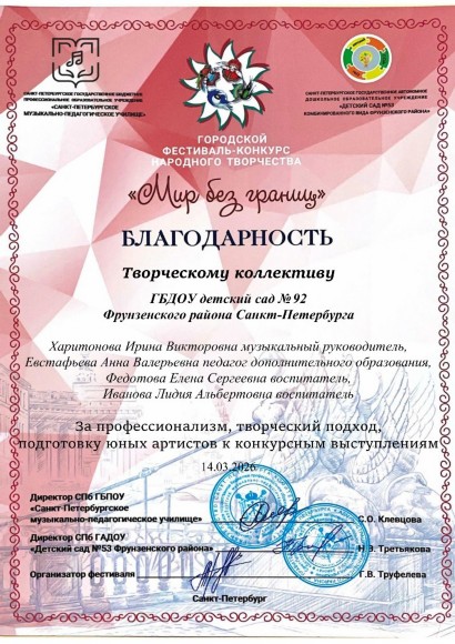 Диплом за участие в районном фестивале «Купчинские первоцветы».Музыкальный руководитель Харитонова И.В. |